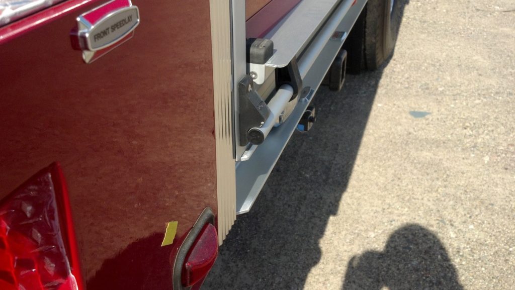 On this apparatus note that the door lift bar latch extends past the rub rail. The aluminum rub rail does nothing more than fill in the gap below the floor of the body compartments. The solution here is to specify that all portions of the rub rail should be spaced away from the body, in addition to providing a space for road debris and water to drain from the rub rail will now actually protect the side of the apparatus body, as originally intended.