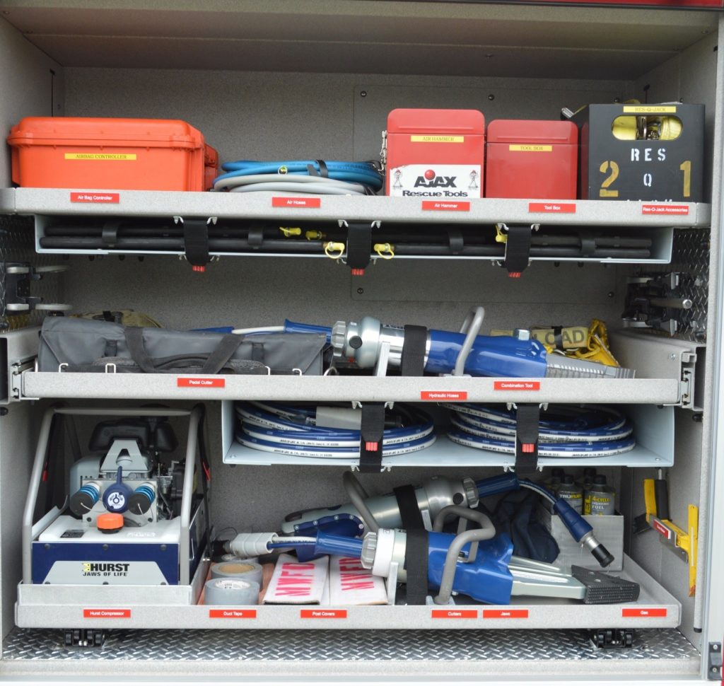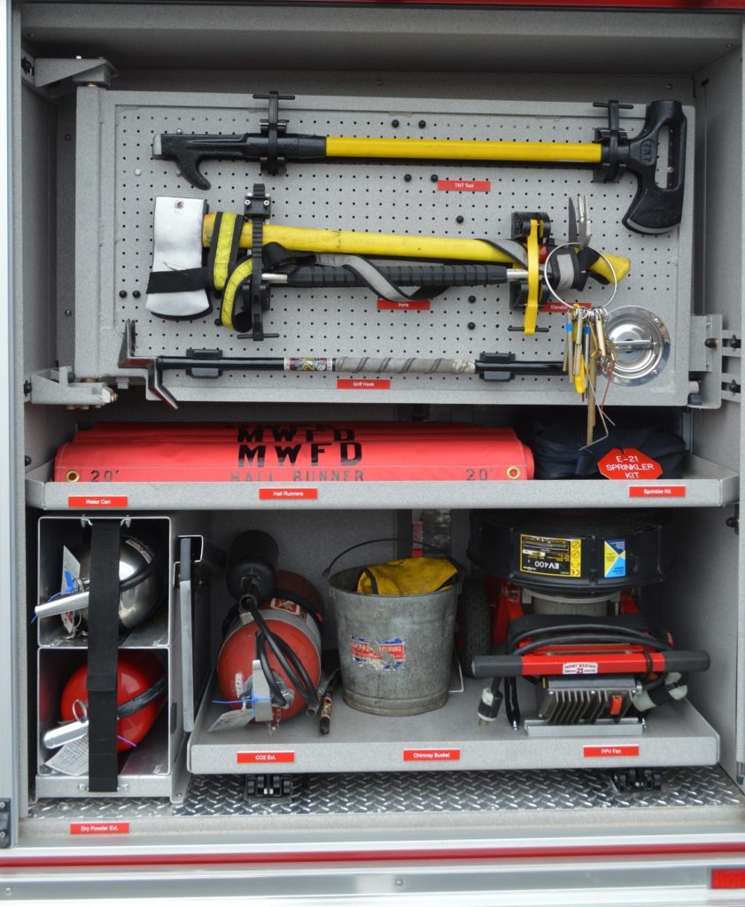The left side rear compartment is outfitted with a swing out tool board, extinguisher module and slide tray. Note the labeling of all equipment to indicate the location of all tools. The tool board has an outline of each forcible entry tool to easily identify missing equipment.
