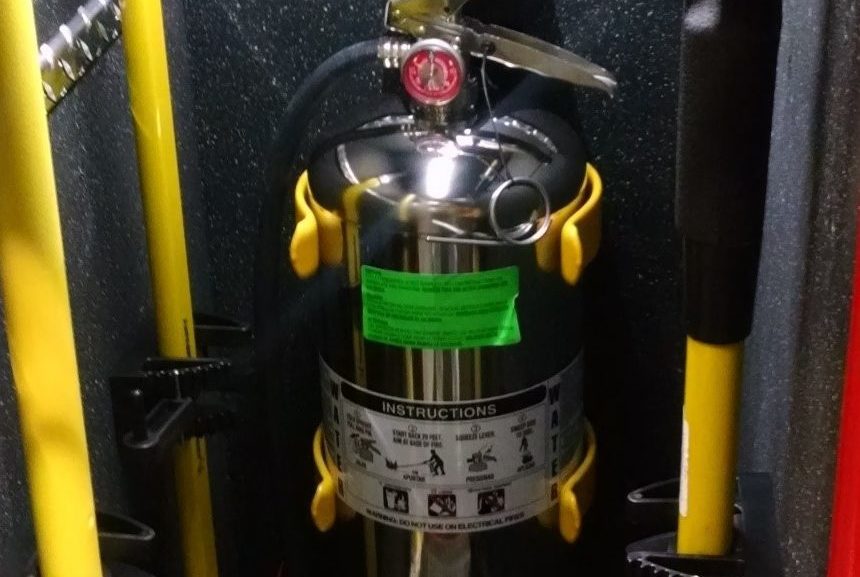 There are many areas where extinguishers can be mounted and secured, yet be readily accessible from the ground by personnel. In the photo below the department utilized a small compartment built into the rear of the cab to mount forcible entry tools, along with the 2.50-gallon water extinguisher. A self-contained breathing apparatus bracket with PVC coated clamps was used to secure the extinguisher to the rear wall.