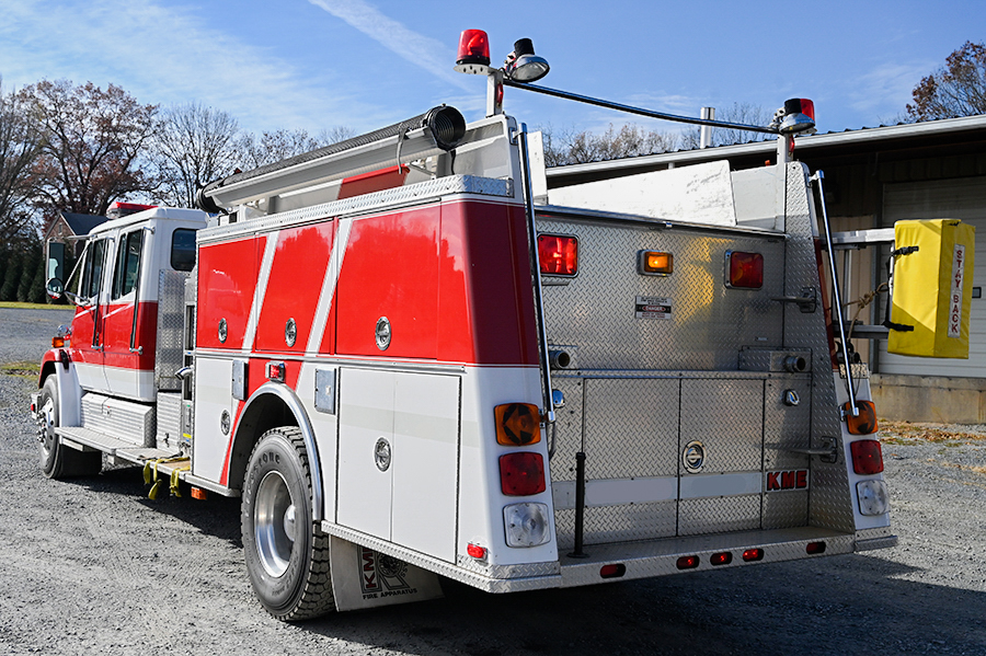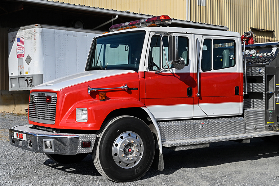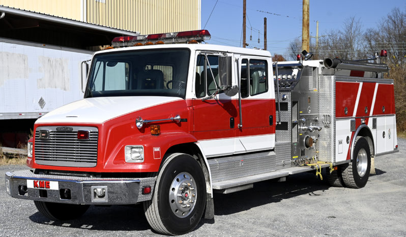 1995 Freightliner/KME 1500/1000 Rural pumper, Freightliner FL-80 conventional 4 door chassis with 5 person seating (4 SCBA), powered by a Cummins 8.3L 300 HP diesel engine and Allison MD3060P 5 speed automatic transmission, KME body, 1500 GPM Hale single stage TOP MOUNT fire pump, 1000 gallon poly booster tank, pre-piped deck gun (included), 1 crosslays, 2 speedlays, high side compartments on drivers side, Large pass through compartment on rear, SCBA cylinder holders in wheel well, 2 6″ hard suction hose, 2 aluminum ground ladders (24′,14′), ONLY 22,500 miles, only 2241 engine hours,40,600 lb. GVWR, lightbar, Code 3 electronic siren, dual Grover air horns, aluminum wheels, ……………..$37,000