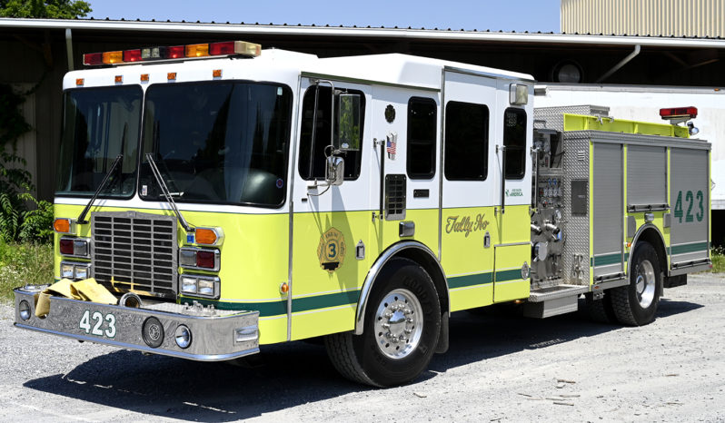 1997 HME 1500/500 pumper, HME 4 door enclosed chassis with raised roof tilt cab, seats 7 with SCBA seats, A/C in the cab, powered by a Detroit Diesel 455 HP engine, Allison automatic transmission, Telma electric retarder, 1500 GPM Hale 2 stage fire pump, 500 gallon poly tank,  pre-piped for deck gun, booster reel on rear, 2 crosslays, 5″ hose front suction intake on extended front bumper, RD Murray stainless steel pumper body with roll up doors, adjustable shelves and pull-out tool trays, 2 side mounted aluminum ground ladders, 2 floodlights mounted on the pump panel sides, aluminum wheels, Federal Q2B siren, electronic siren, federal Q siren, air horns, 32,000 miles, 4,000 engine hours, 2 wheel chocks, all hose shown is included, ready for service……………………………$39,500