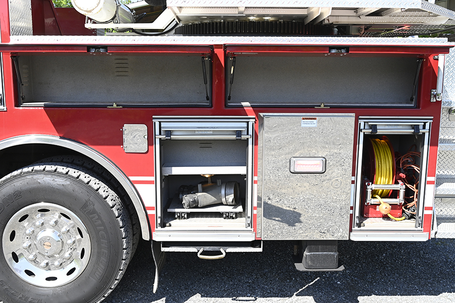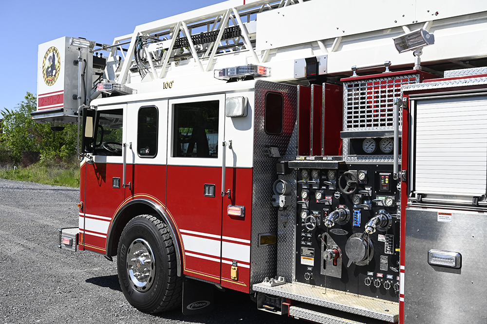 1999 Pierce 100′ Aerial Platform Quint, 4 door enclosed air conditioned tilt Dash cab with seating for 8 (5 SCBA) powered by a Detroit Diesel 60 series 550 HP engine with Jake brake, Allison automatic transmission, automatic snow chains, Hale 2000 GPM two stage fire pump, 300 gallon poly tank, Pierce aluminum body with compartments on BOTH sides of body, Pierce 100′ rear mount aerial platform with pre-piped nozzle, 500lb tip rating, 3 crosslays, 10KW generator with telescoping pole mounted quartz lights, (2) mounted on bucket, (2) cord reels, breathing air to platform with 2 air cylinders, aerial intercom, Side hose chute with capacity for 5″, aluminum ground ladders, current pump and aerial certificates, Upgraded LED lighting, electronic siren, Federal Q2B, Rear traffic advisor, rear vision camera, Extended front bumper with hose tray, Dual air horns in bumper, SS wheel liners, 1,600 aerial hours, 3,600 engine hours and only 26,000 miles.. available for $175,000