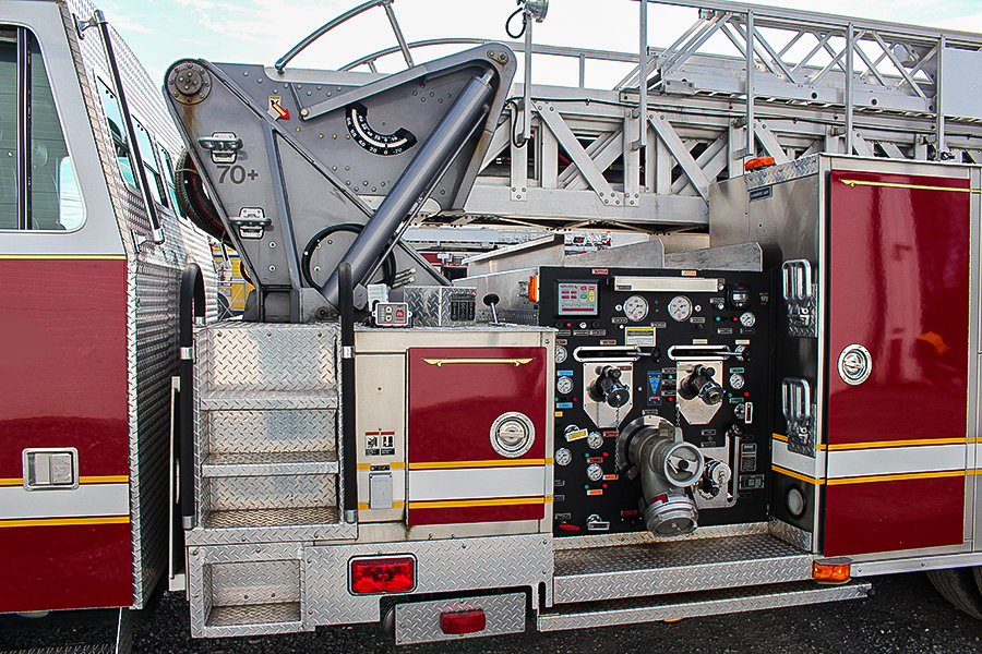 1999 Sutphen 1500/400 70′ Quint midmount platform, 4 door custom cab with seating for 6 firefighters, 5 SCBA seats, powered by 60 Series Detroit 370HP diesel engine with 3 stage jake brake, Allison HD4060P automatic transmission, A/C, 1500 GPM Hale QMax pump, 400 gallon fiberglass tank, 2 crosslays over pump panel, 200′ (1″) hose reel on rear, (2) turret guns, 750lb tip load, 6KW hydraulic generator, Cord reel, (2) halogen scene lights on cab, (2) LED scene lights on bucket, Sutphen stainless steel body, lightbar and electronic siren, dual air horns, 24′ extension ladder, 14′ roof ladder, 10′ folding ladder, SCBA cylinder holders in the wheel wells, Aluminum wheels, ONLY 9,200 MILES and 1,050 hours – $175,000
