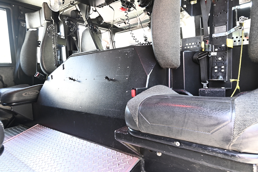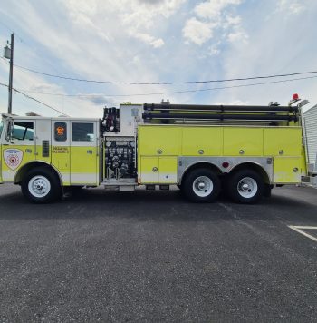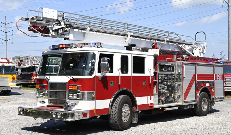 2000 Pierce Sky Boom 61′ Ladder Quint, powered by a 430 HP Detroit Series 60 engine with an Allison HD4060 5 speed automatic transmission, 75 gallon fuel tank, Jake brake with 3 position switch, Air Conditioned aluminum Pierce Dash tilt cab with seating for 6 (5 SCBA), Cab is wired for intercom system, dual air horns, PA siren, Q2B siren, warning lights recently upgraded to LED, 61’ aerial ladder with wireless remote control, prepiped waterway with Elkhart stinger, hydraulic outriggers, rear waterway inlet, Waterous 1250 GPM single stage pump, 600 gallon poly water tank, 26″ extended front bumper with center tray for 150′ 1.75″, 6″ intake each side, (2) 2.5″ discharges on drivers side, (1) 2.5″ and (1) 4″ discharge officers side, (2) 1.5″ and (1) 2.5″ speedlays with trays, (1) 2.5″ Discharge on rear, 3″ Deluge outlet, aluminum body with high side compartments on both sides with roll up doors, AMPS 10 KW hydraulic PTO generator, 200′ electric cord reel, multiple quartz lights, aluminum ground ladders mounted on hydraulic rack, current ladder and pump certifications, only 21,000 miles, 3100 engine hours and only 425 aerial hours.