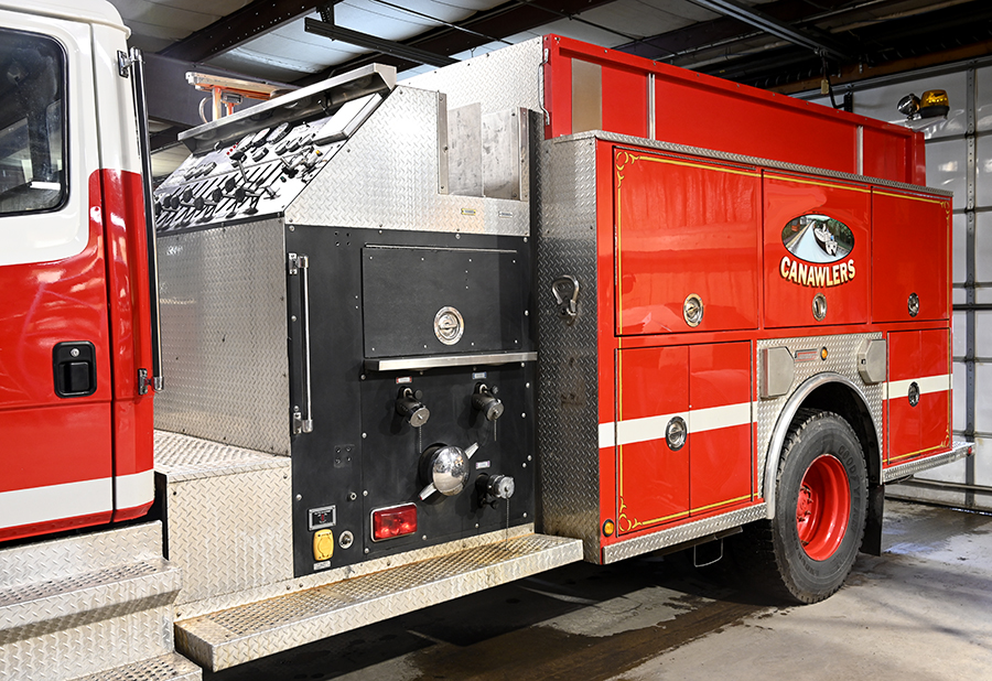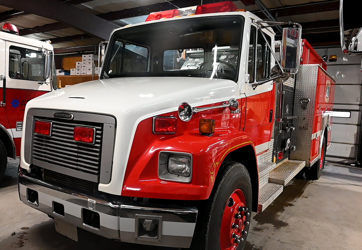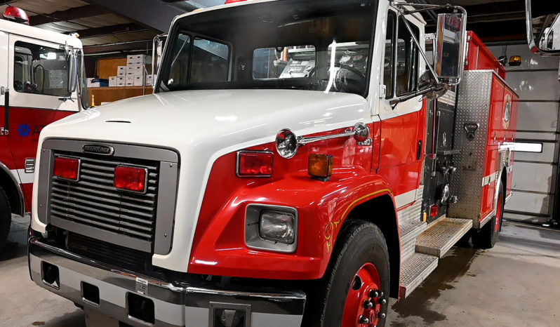 2000 Freightliner 1250/1500 Rural pumper, Freightliner FL-80 conventional 2 door chassis with 3 person seating, powered by a Cummins 8.3L 300 HP diesel engine and Allison 5 speed automatic transmission with retarder, Summit body, 1250 GPM Hale single stage TOP MOUNT fire pump, 1500 gallon poly booster tank, 2 crosslays, high side compartments on drivers side with some pull out trays, SCBA cylinder holders in wheel well, 10″ Newton manual quick dump with swivel shoot in rear, ONLY 18,000 miles and 1,500 engine hours, 2 aluminum ground ladders (24′ and 14″ , 2 6″ hard suction hoses, lightbar, electronic siren, dual Grover air horns, vinyl hose bed cover, rack for drop tank on right side of body, rear tires almost new ……………..$65,000