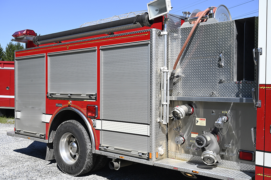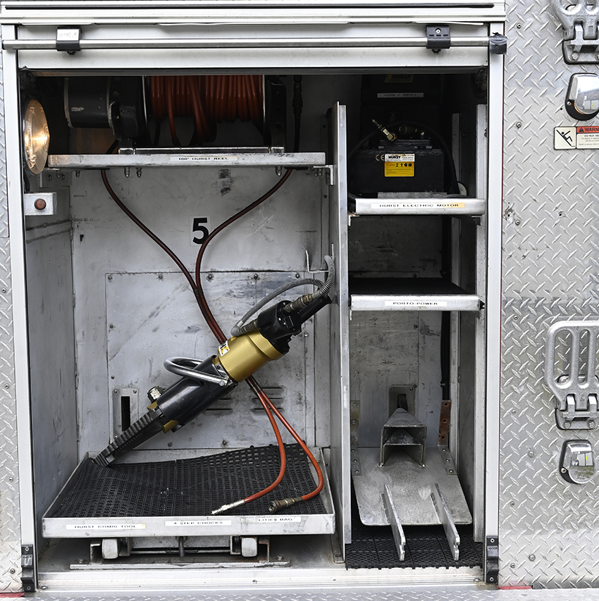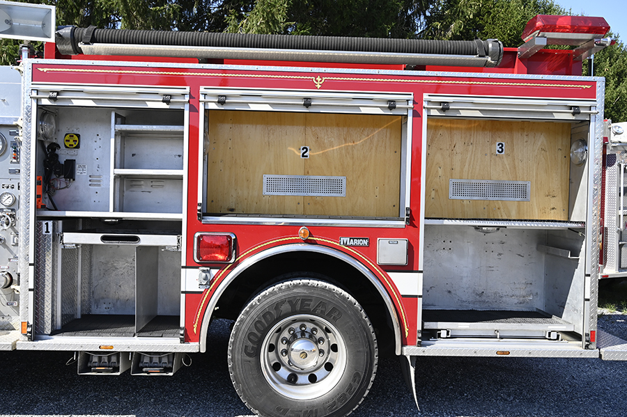 2001 HME/MARION RESCUE PUMPER, HME 4 door enclosed chassis with raised roof cab, 6 seats with 5 SCBA seats, A/C in the cab, powered by a Detroit Diesel 330 HP engine, Allison automatic transmission, 1500 GPM Hale 2 stage fire pump, 750 gallon poly tank, AMPS 10 KW PTO driven generator, pre-piped deck gun with ground attachment, booster reel above the pump panel with TFT booster nozzle, 2 crosslays, front trashline discharge, front suction intake on extended front bumper, 2 rear preconnects in hose bed, Marion all aluminum rescue pumper body with adjustable shelves and pull-out tool trays, 3 aluminum ground ladders mounted inside body (24′, 14′, 10′ attic), 2 each 6” hard suction hoses with strainer mounted on top of body, aluminum roll-up compartment doors, Hydraulic Reel, Hydraulic Hose, and Holmatro Combi-Tool with mounting bracket, aluminum wheels, electric rewind cord reel with junction box, 2 tripod lights, lightbars, Federal Q2B siren, rear Arrowstick light, 57,000 miles, 5500 engine hours, excellent condition……………………………$82,500