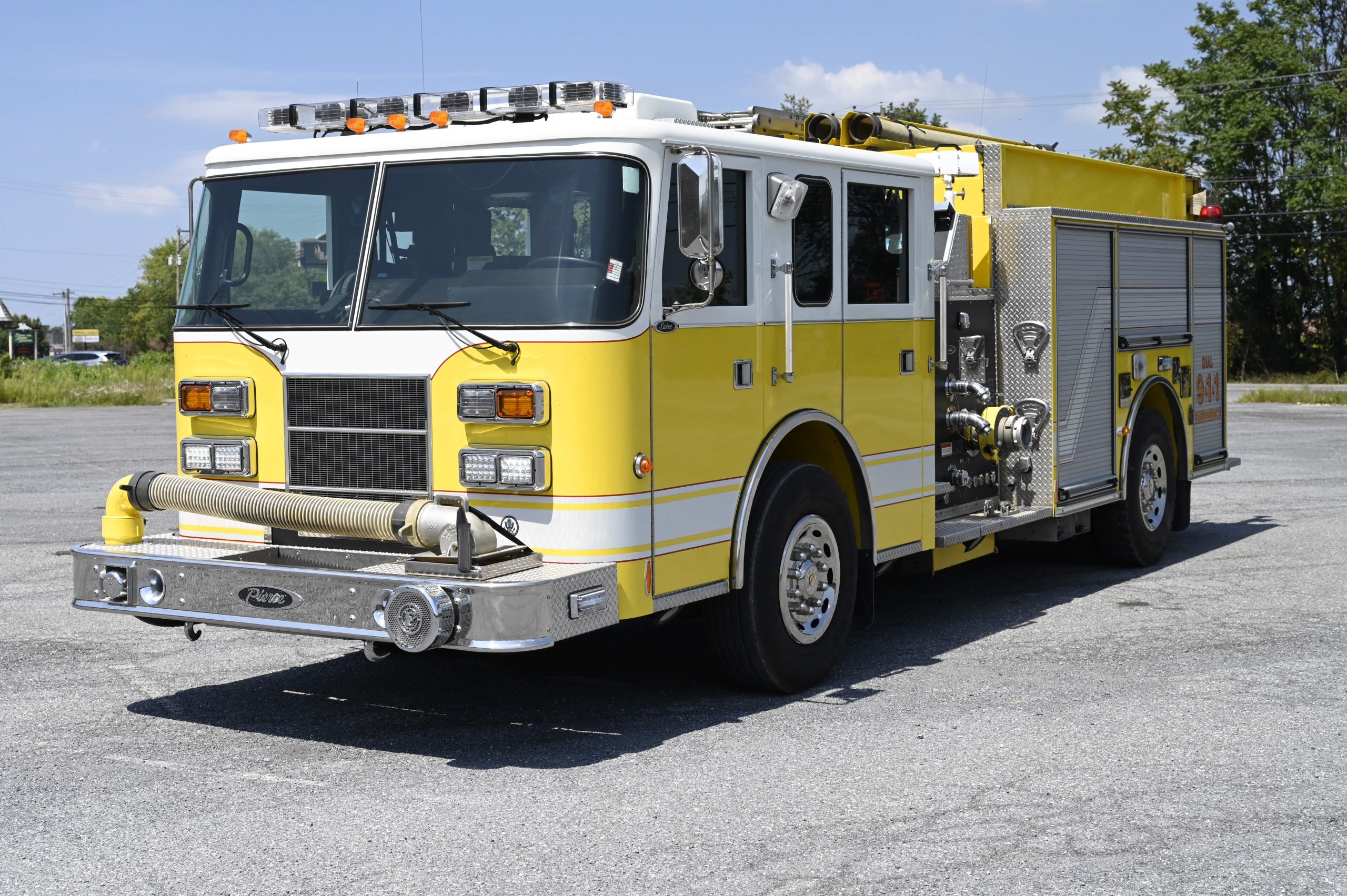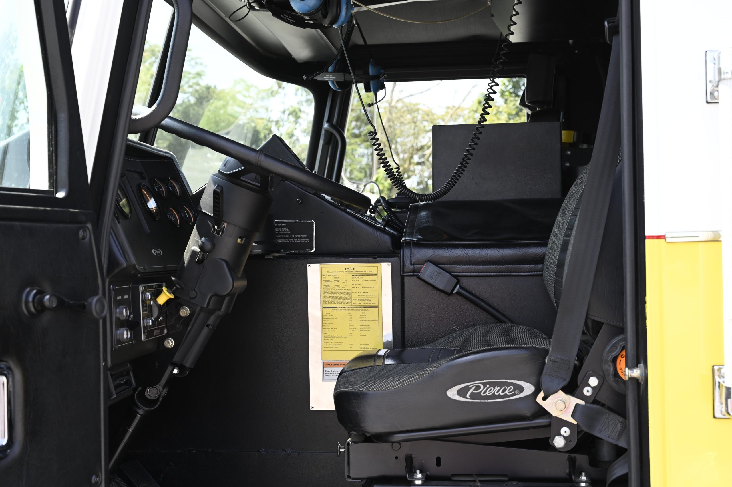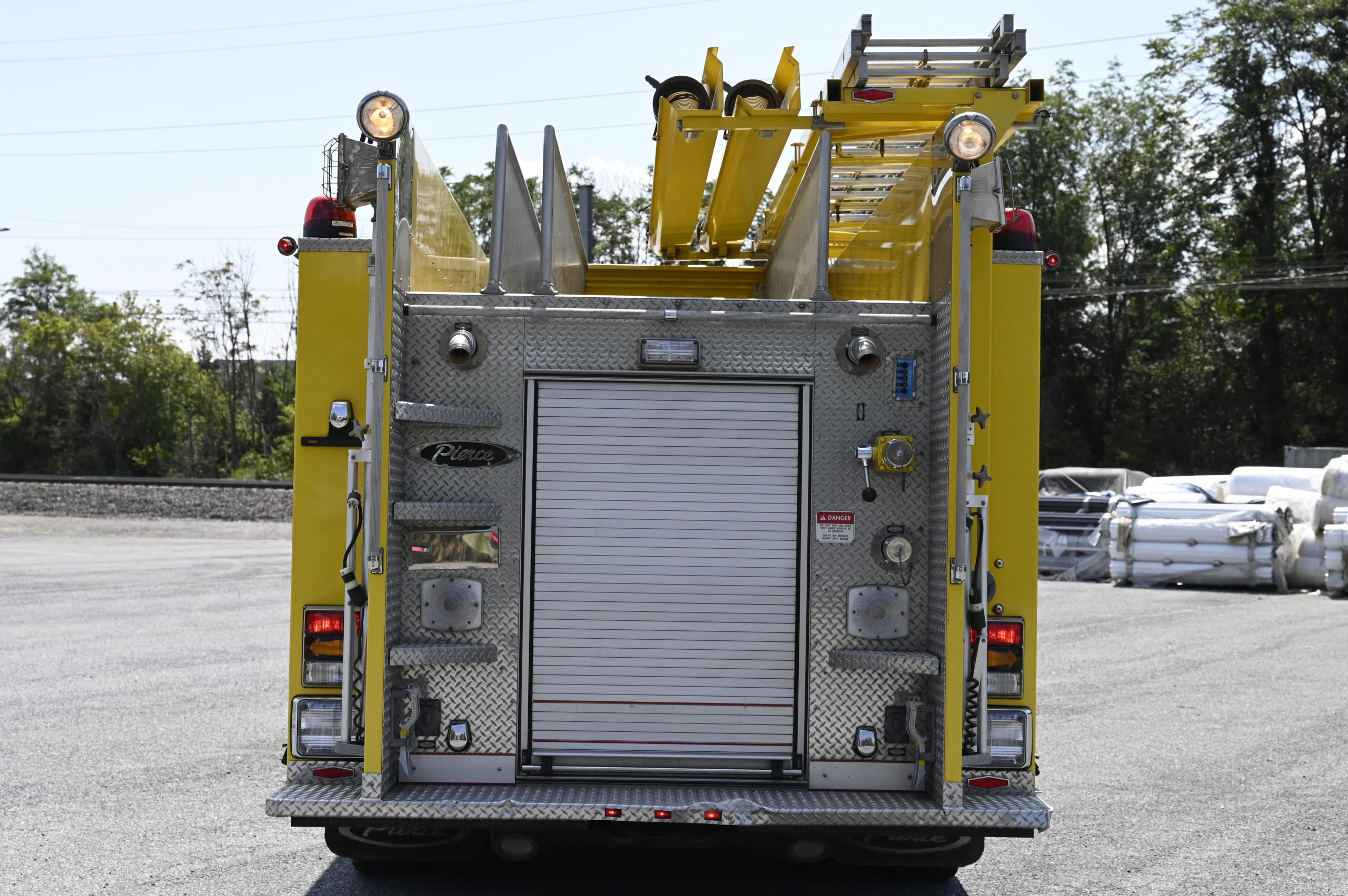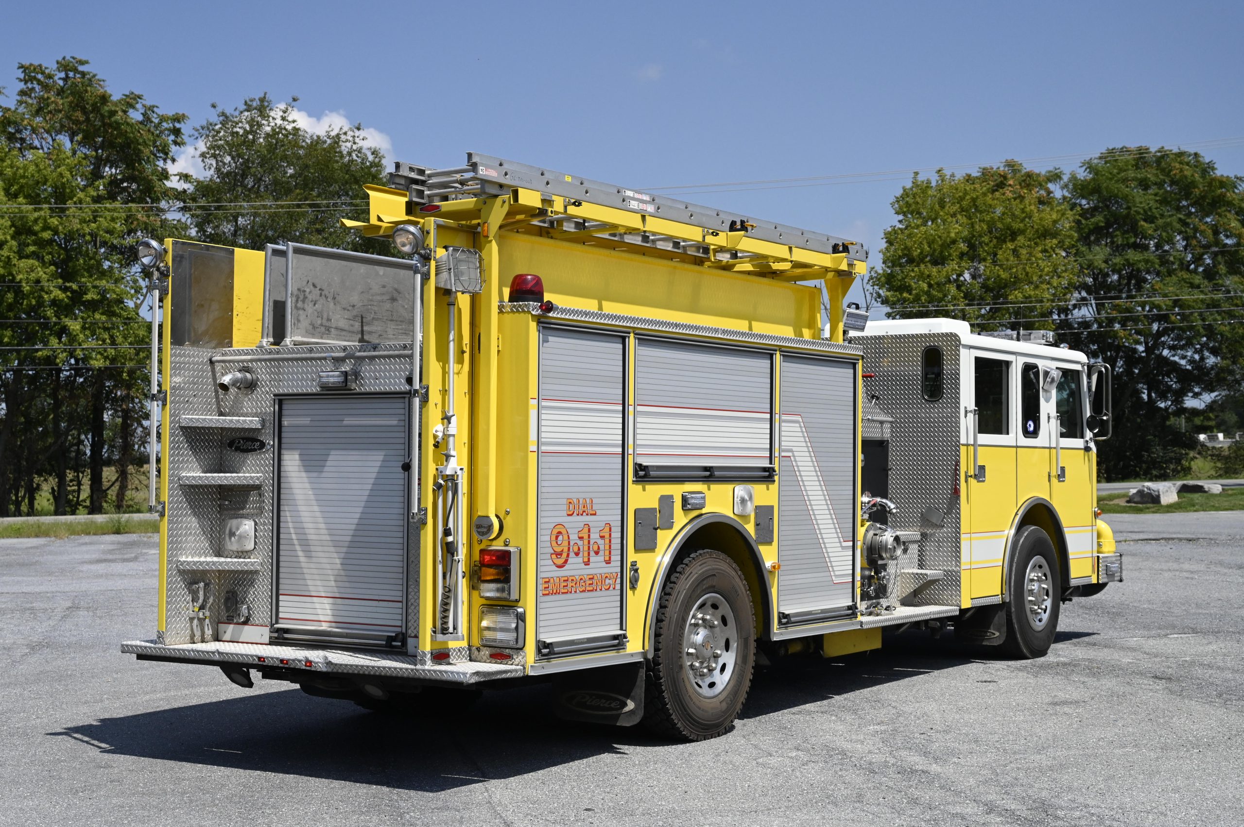 2001 Pierce 1250/1000 Rural Pumper, 4 door custom Saber flat roof air conditioned cab with seating for 6 (5 SCBA seats), powered by a 350HP Cummins ISC diesel engine with Jake Brake, Allison MD3066 automatic transmission, 1250 GPM Two stage Waterous CM Top mount pump, 1000 gallon poly tank,  2.5″ rear direct tank fill, (2)1.75″ crosslays, TFT extend-a-gun deck gun, 12″ extended front bumper with 5″ intake hooked to low level strainer, and hose tray, Aluminum Pierce body, 2 telescoping LED quartz lights mounted at pump panel, (2) tripod quartz lights mounted on rear,  Smart Power 8500W PTO generator,(2) 200′ cord reels mounted in rear compartment, hydraulic ladder rack with 24′, 12′, 10′ ladders and two 6″ lightweight suction tubes, electronic siren, Federal Q2B siren, LED Emergency lighting, SCBA cylinder holders in the wheel wells, Headset system, 1,534 engine hours, 23,670 Miles ….. $89,000