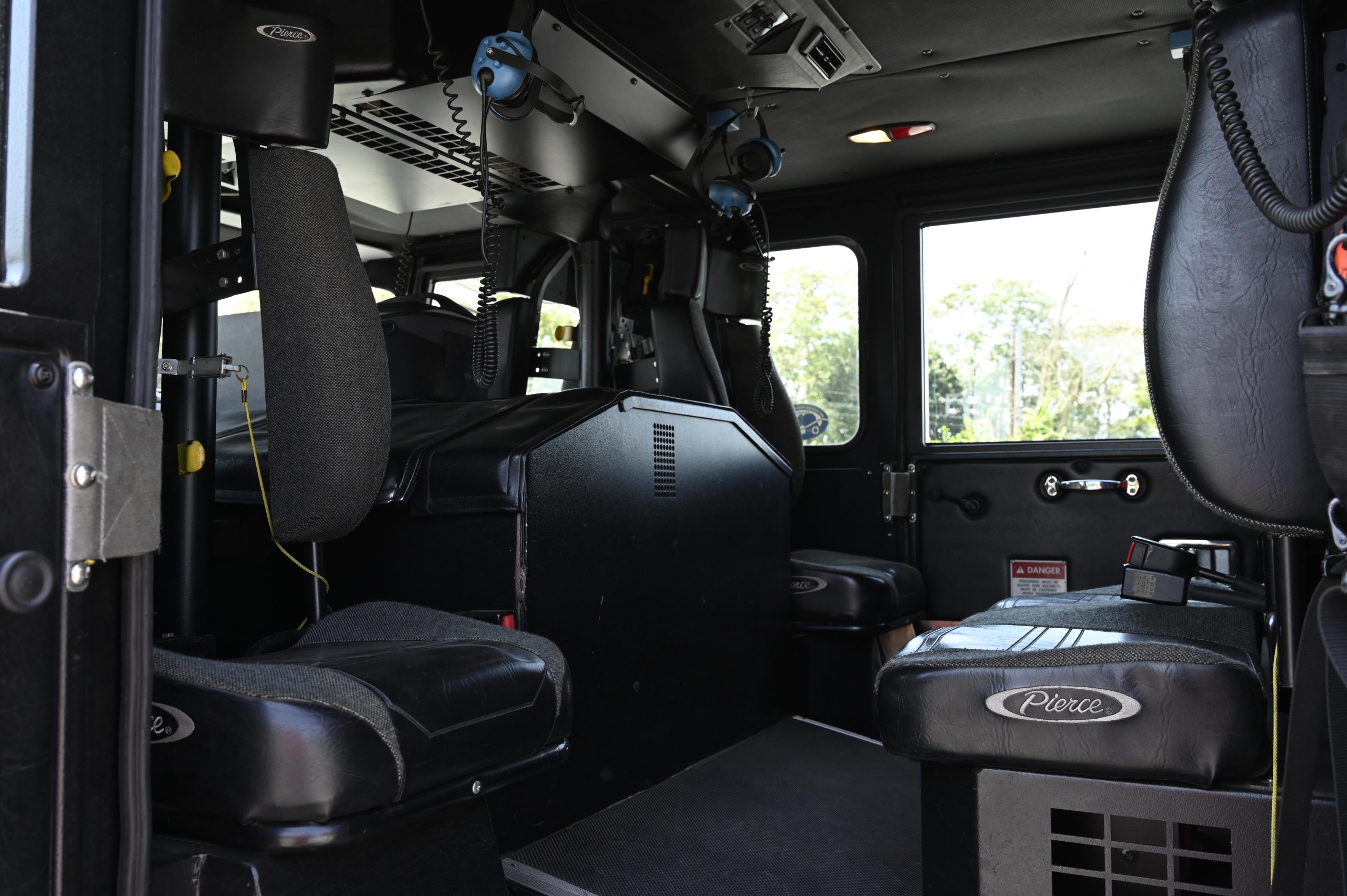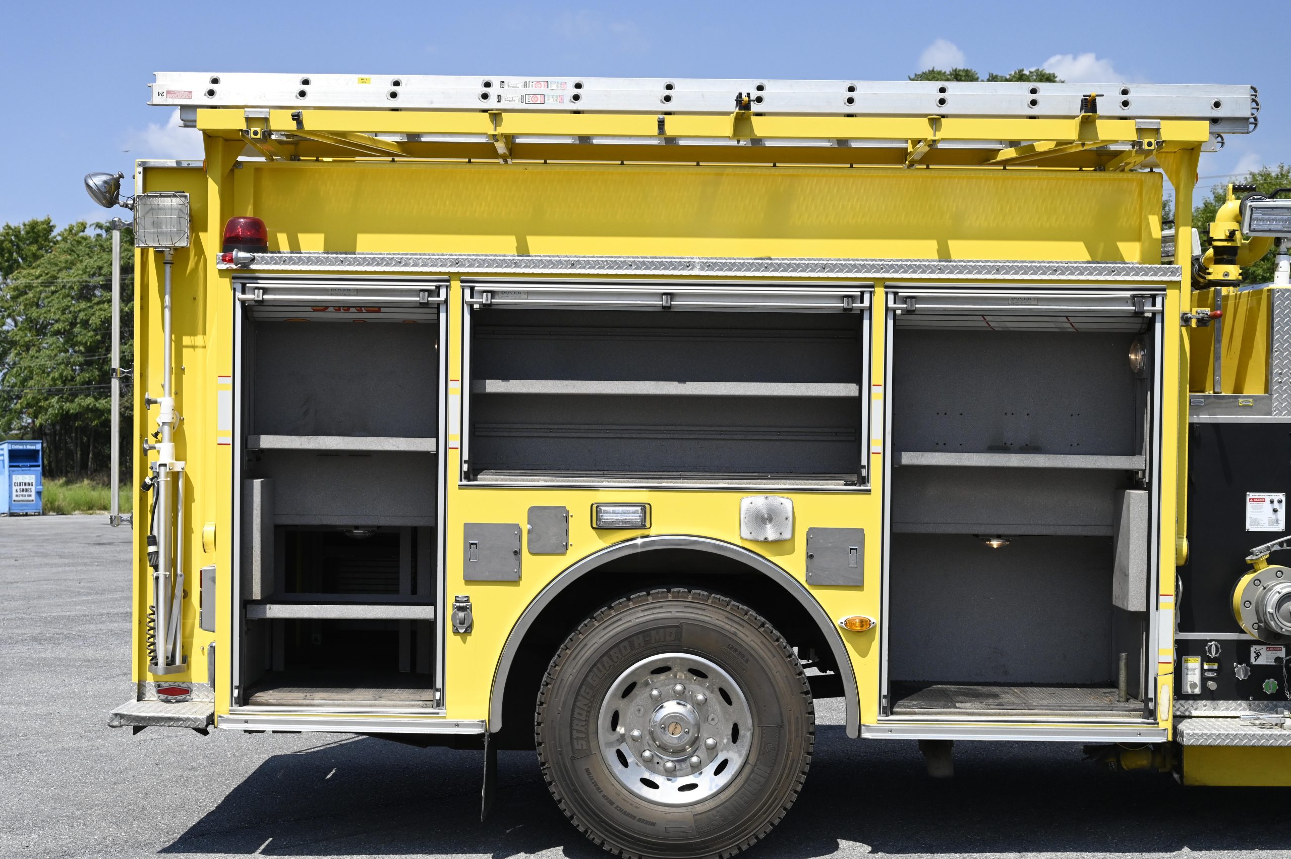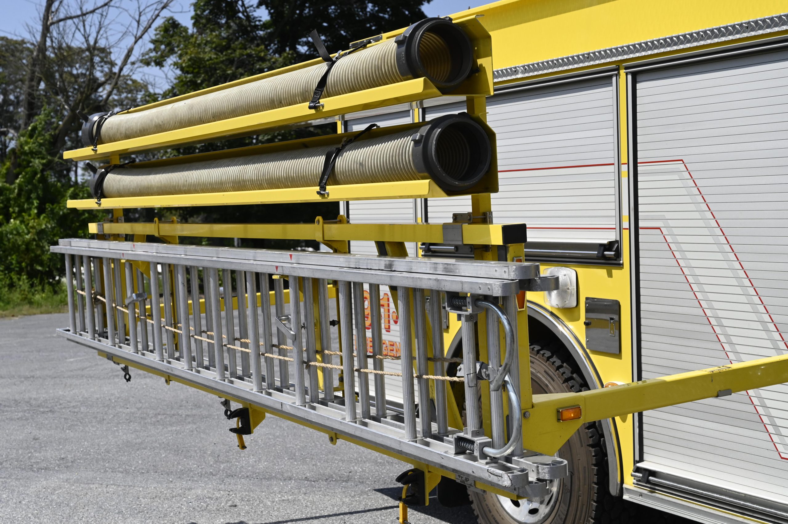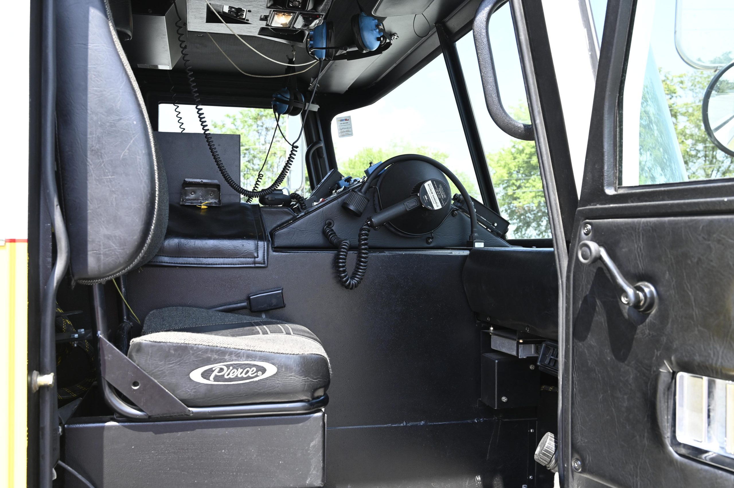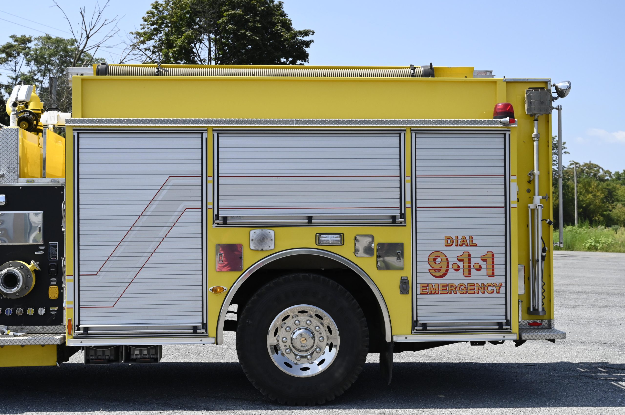 2001 Pierce 1250/1000 Rural Pumper, 4 door custom Saber flat roof air conditioned cab with seating for 6 (5 SCBA seats), powered by a 350HP Cummins ISC diesel engine with Jake Brake, Allison MD3066 automatic transmission, 1250 GPM Two stage Waterous CM Top mount pump, 1000 gallon poly tank,  2.5″ rear direct tank fill, (2)1.75″ crosslays, TFT extend-a-gun deck gun, 12″ extended front bumper with 5″ intake hooked to low level strainer, and hose tray, Aluminum Pierce body, 2 telescoping LED quartz lights mounted at pump panel, (2) tripod quartz lights mounted on rear,  Smart Power 8500W PTO generator,(2) 200′ cord reels mounted in rear compartment, hydraulic ladder rack with 24′, 12′, 10′ ladders and two 6″ lightweight suction tubes, electronic siren, Federal Q2B siren, LED Emergency lighting, SCBA cylinder holders in the wheel wells, Headset system, 1,534 engine hours, 23,670 Miles ….. $89,000