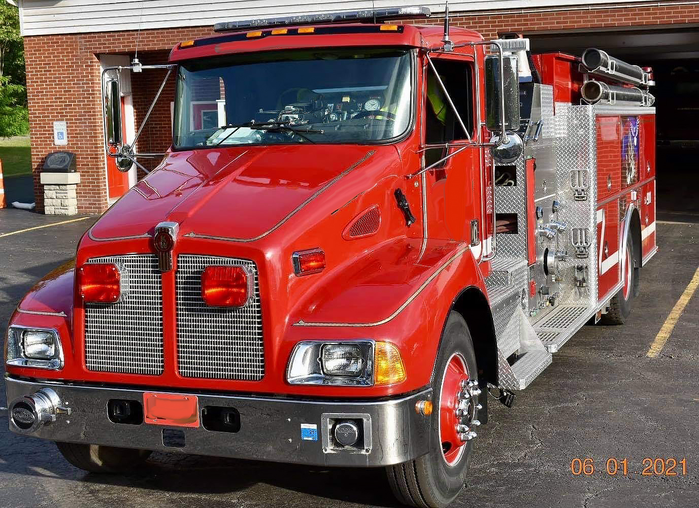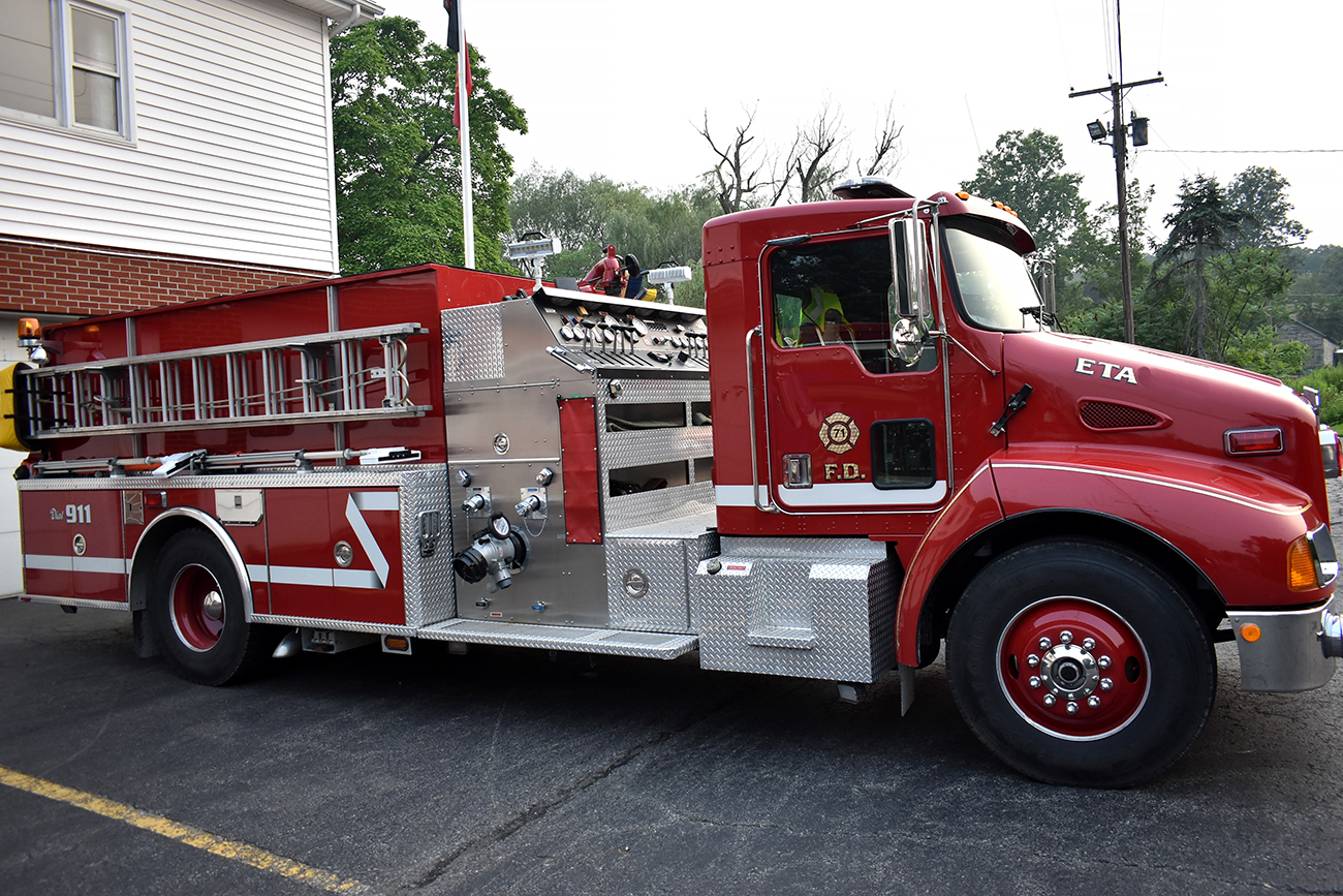 2002 Kenworth/KME 1500/1000 Rural Pumper, Kenworth T300 conventional chassis with 2 person seating, air conditioning, powered by a Cummins 330HP diesel engine with Exhaust brake, and automatic transmission, KME Aluminum body, 1500 GPM Hale Two stage Top Mount fire pump, 1000 gallon poly booster tank, Front intake, TFT deck gun, 2 crosslays, 100′ booster reel in rear, high side compartments on driver side, SCBA cylinder holders in wheel well, (4) 6′ hard suction hose, aluminum ground ladders, Emergency light package, electronic siren, (2) Telescoping LED scene lights, (2) Tripod mounted LED lights, 38,000 GVW, 1300 engine hours, ONLY 18,000 miles ……..$78,000