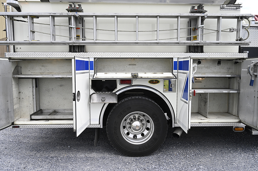 2003 KME Rescue Pumper, Excel heavy duty chassis, 6 Person enclosed cab, only 33,700 Miles, DOT/Pump/Ladder Tests in May 2022, Cummins ISM 450HP Engine, HD-4060P Allison Automatic Transmission, Jacob’s engine brake, Waterous CS-Y 1250 GPM single stage side mount pump, Foam Pro System, air primer,  front and side intakes, 750 gallon water & 40 gallon foam poly tanks, bumper discharge line, pre-piped deck gun, 2 crosslays, 2 preconnected hose bed discharges, 150’ booster reel, 320 AMP alternator,10KW PTO generator, Wil-Burt light tower, electric cord reel, electric & Q2B mechanical sirens, Roto Ray light on front, LED Lighting, radio hook up, Sigtronics headsets, 5 SCBA seats, cylinder storage, hand lights, slide-out trays & dividers, spacious cab storage, 30ft of hard suction, 2 NFPA ground ladders, pike poles, painted WHITE with blue reflective striping….$ 125,000.00