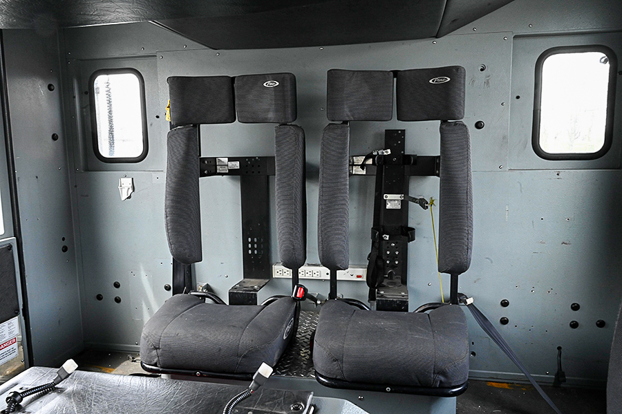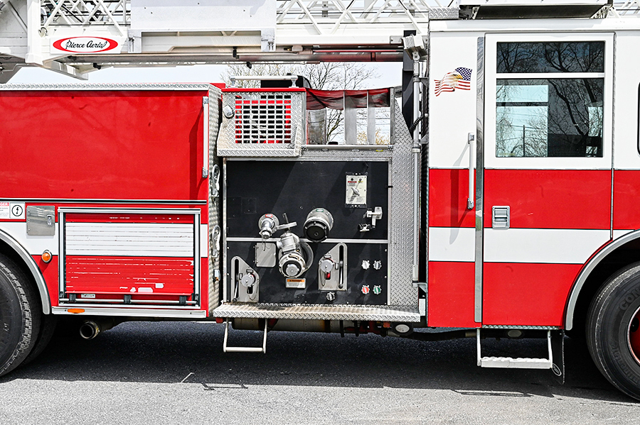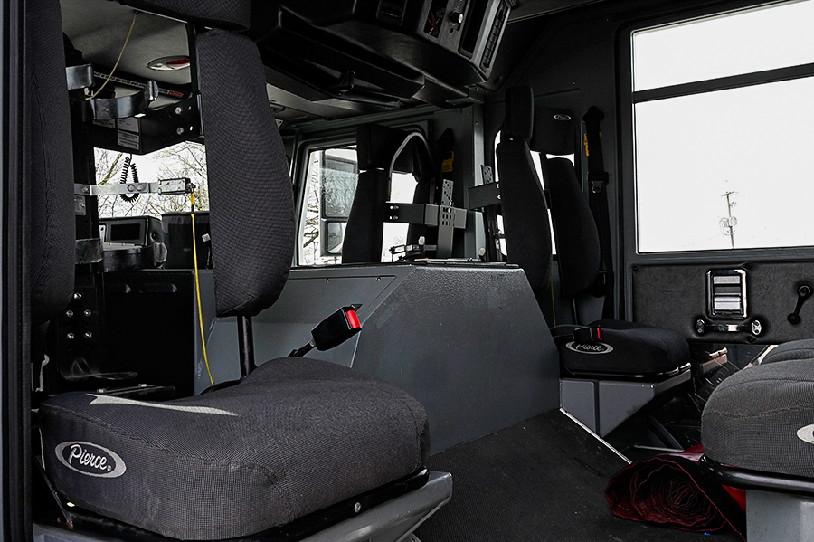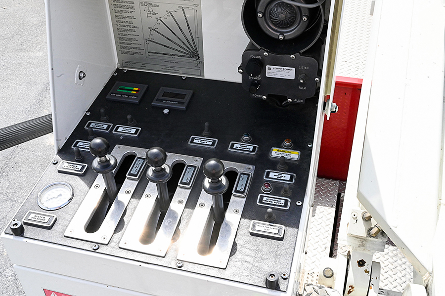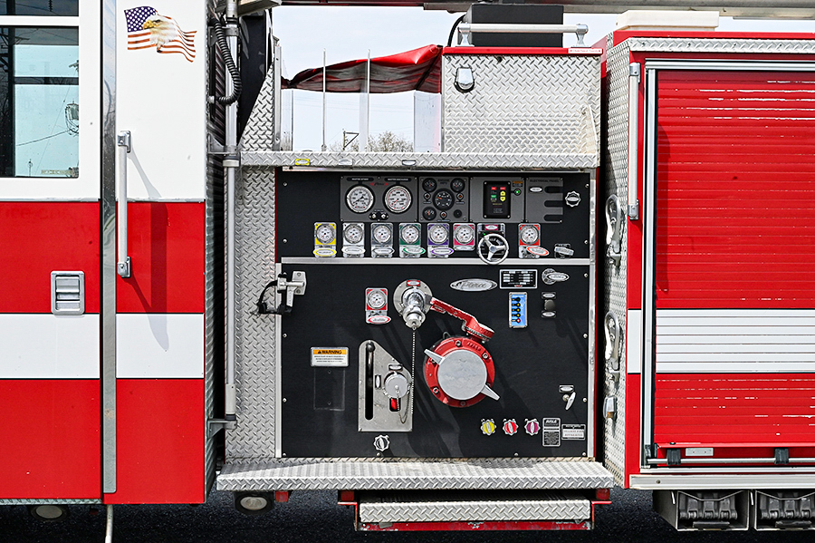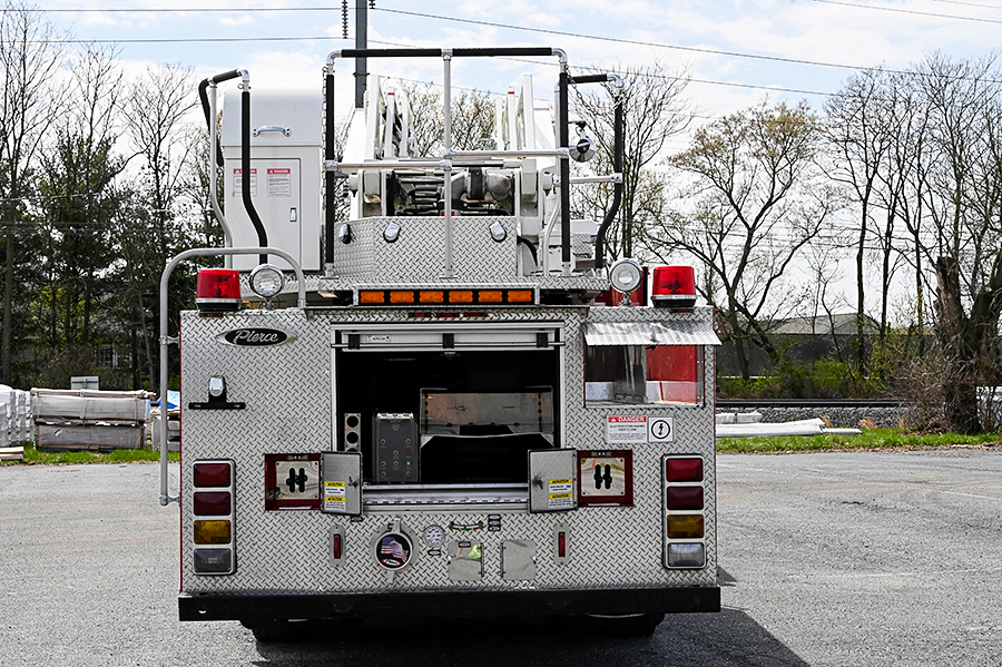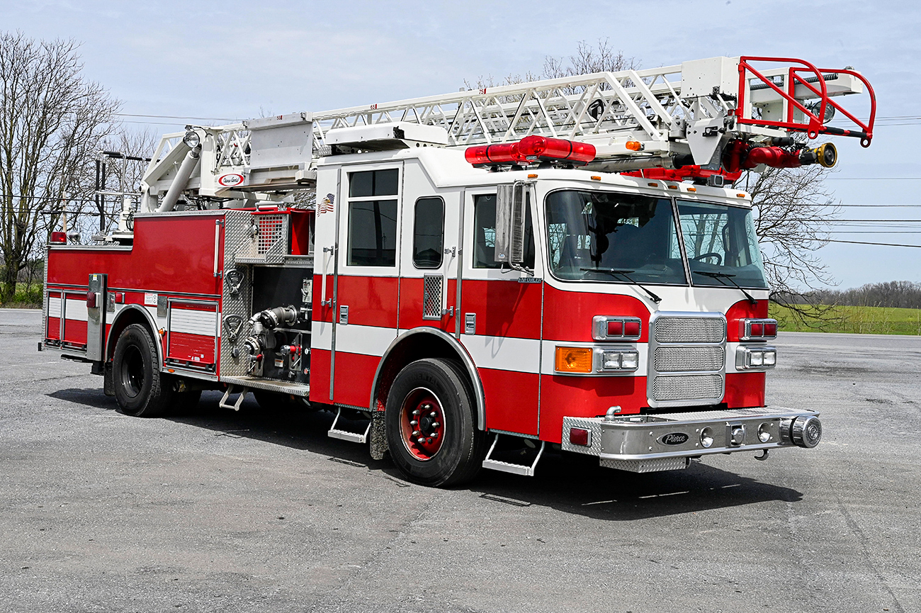 2003 Pierce 75′ Aerial Quint, Pierce 67″ Enforcer 4 door enclosed cab with 10″ raised roof, 6 seats (5 SCBA), powered by a Cummins ISL 400 HP diesel engine and Allison 3000EVS 5 speed automatic transmission, 2 stage Jake brake, A/C, 1500 GPM Hale QMax-150 single stage fire pump, (2) 1.5″ & (1) 2.5″ crosslays, 500 gallon poly booster tank, 19″ front bumper 1.5″ outlet with hose tray, 75′ 3 section rear mount ladder, 500 lb. tip load, 1000gpm pre-piped waterway with Elkhart monitor on aerial tip, Pierce Aluminum body with aluminum roll-up doors on both sides, 35′, 14′ and 10′ aluminum ladders, 6 KW Harrison hot shift hydraulic PTO generator, 1 electric rewind cord reel with junction box, (2) telescoping scene lights mounted on rear of cab, light on ladder tip, emergency light package, electronic siren, Federal Q2B, Rear arrow stick, air horns, 50,500 lb. GVWR, 206.5″ wheelbase, ONLY 37,500 miles, 3,500 engine hours 754 aerial hours, $ 215,000