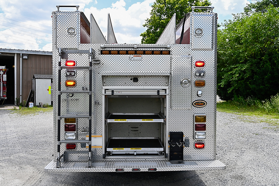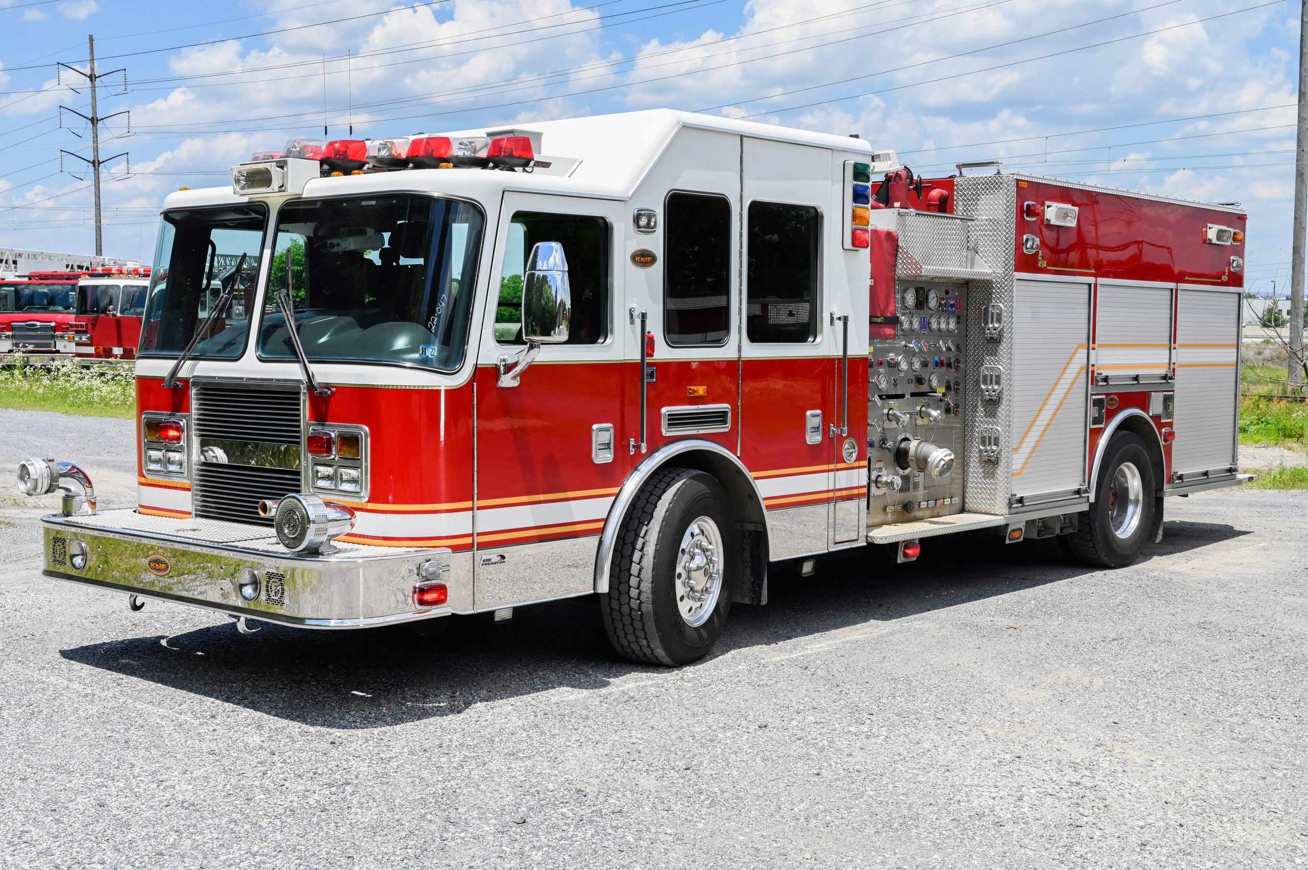 2006 KME 1500/750 Rescue Pumper, 4 door Predator custom raised roof cab with seating for 8 (5 SCBA seats), powered by a 455HP Detroit Diesel 60 series engine, Allison 4000EVSP automatic transmission, A/C, Side mount 1500 GPM Hale stage pump, current pump test, 750 gallon poly tank and 50 gallon foam tank, 12 total discharges, 6 intakes, (4) crosslays, deck gun, Extended front bumper with one discharge and 5″ intake, KME Rescue body with HIGH SIDE compartments on both sides with roll up doors, coffin compartments on top, 2 quartz lights mounted on each side of the body, brow light, 2 mounted telescoping lights on rear of cab, Harrison PTO generator, (2) 200′ cord reels,  1 – 35′ 3 section, 1 – 14′ straight roof, and 1 10′ folding attic ladders, 2-5″ 10′ hard suction sleeves, light package and electronic siren, Federal Q2B siren, dual horns, SCBA cylinder holders in the wheel wells, 2 wheel chocks, Aluminum wheels, Rear vision camera and traffic arrow, GVWR 51,000 lbs, ONLY 18,000 Miles…………..$ 169,000