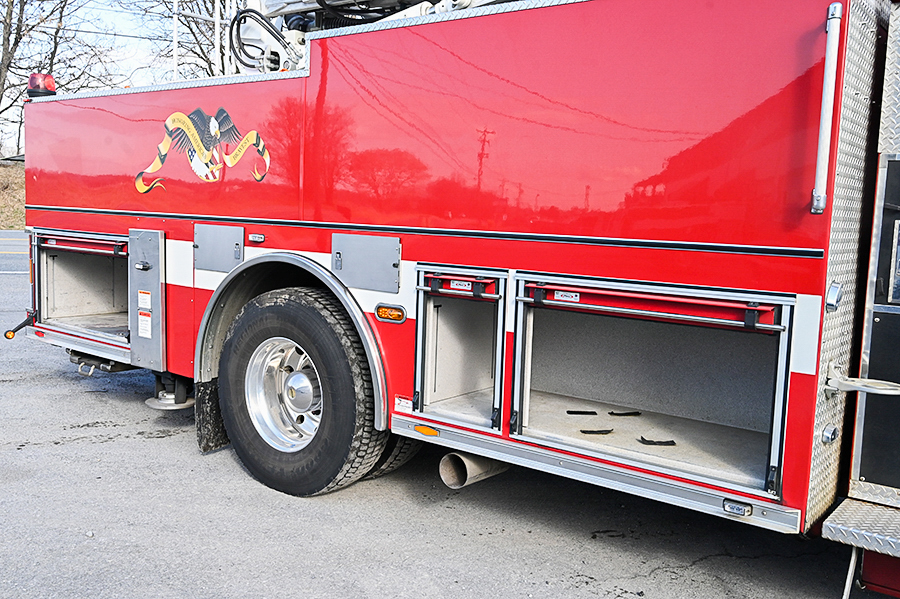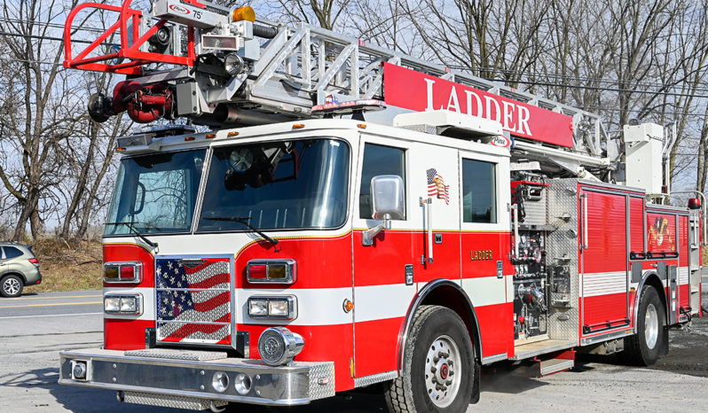 2010 Pierce 75′ Aerial Quint, Pierce Saber 4 door enclosed cab with 4 seats (3 SCBA) and Double EMS cabinets, powered by a Cummins ISL 425 HP diesel engine and Allison 3000EVS 6 speed automatic transmission, Jake brake, A/C, 1500 GPM Waterous CSU single stage fire pump, (2) 1.5″ & (1) 2.5″ crosslays, 400 gallon poly booster tank, Husky foam system with 30 gal Class A tank, 16″ front bumper 1.5″ outlet with hose tray, 75′ 3 section rear mount aluminum ladder, 750 lb. tip load, High flow 1500gpm pre-piped waterway with Akron electric controlled monitor on aerial tip, Pierce Aluminum body with aluminum roll-up doors on both sides, 35′, 24′, 16′, 16′ and 10′ aluminum ladders, 6 KW Harrison hydraulic generator, 1 electric rewind cord reel with junction box, 3 750W lights on body, brow light on cab, light on ladder tip, LED warning lights, siren, Federal Q2B, air horns, 49,000 lb. GVWR, Aluminum wheels, 221″ wheelbase, ONLY 13,500 miles, 1260 engine hours 448 aerial hours,